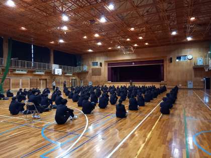 3年生の学年集会の様子です。毎週金曜日の定例の3年生学年集会も残すところあと1回となりました。学年の先生から私立高校に合格した人も、公立高校合格に向けて頑張っている仲間のことを思いやって行動してくださいとお話がありました。