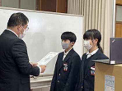 今日は、「2月 あいさつ運動」の際に行われた「ベストあいさつ賞」の表彰が行われました。クラス部門では、1年1組、2年2組、3年2組が、ベストあいさつクラブは、男子バスケットボール部が選ばれました。個人でも各学年から1人ずつ表彰を行いました。