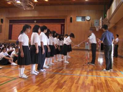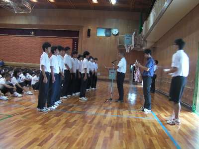 吹奏楽部、男子バスケットボール部、水泳部、陸上部、剣道部、ソフトテニス部、卓球部、バドミントン部において、団体の部や個人の部でいただいた表彰状や楯の授与を行いました。たくさんの表彰が行われた為、表彰の伝達だけで約25分ほどかかりました。夏休み中にみんなで頑張った成果がここに表れました。