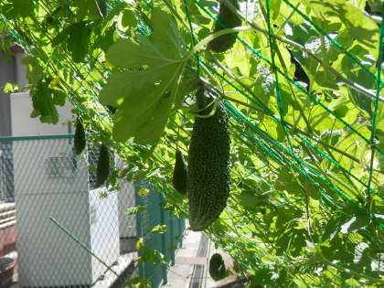夏休みで、大きく成長した人がたくさんいますが、保健室横のゴーヤも同じように大きく成長しました。
