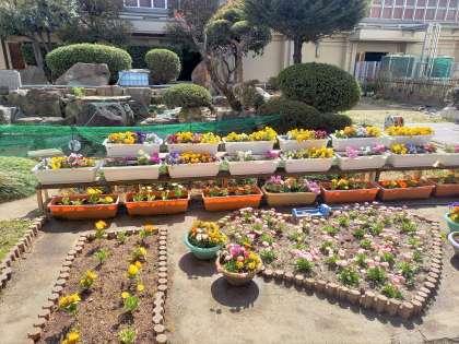 管理作業員さんが、廃材を使って花壇を作ってくれました。春の日差しにかわいい花々も元気に咲いています。