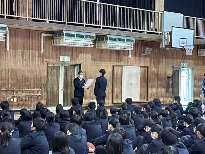 修了式に先立って、楠公杯第3位の男子バスケットボール部表彰と3学期の学級MVPの表彰が行われました。