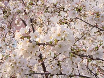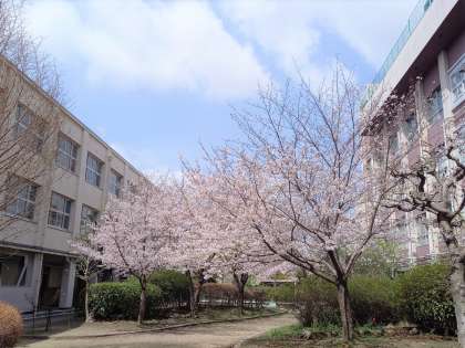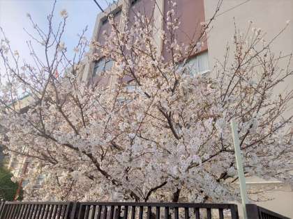 正門横には、満開の桜が訪れる人を出迎えてくれます。