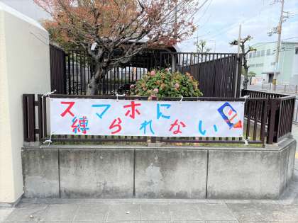 美津島中学校生徒会では、今年度スマホサミットに参加し、美津島中学校の実態やこれまでの取り組みについて発表しました。美津島中学校では『スマホと共存』し、「勉強するときは手の届くところに置かない」「寝るときは、別の部屋に置く」など賢くスマホを使う方法を提唱しています。今回正門前に掲げたスローガン『スマホに縛られない』は、美中生の生徒の約半数が、月〜金に1日4時間以上携帯電話やスマートフォンを使っているというアンケート結果を受けて考えたものです。今一度、スマホとの付き合い方を見直してみましょう。