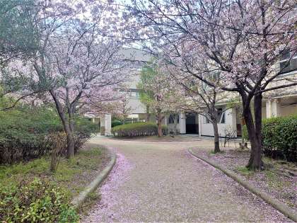 中庭の桜も緑の葉が目立つようになってきました。地面にはピンクの桜の花びらが散っています。