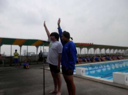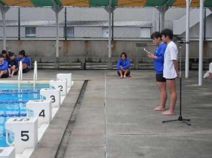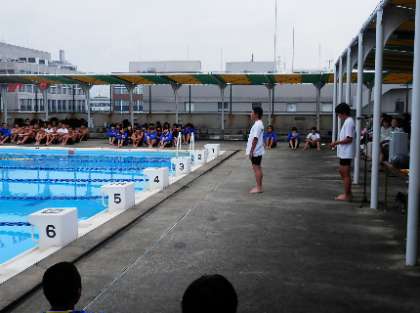 天候が心配される中、始まった2年生の水泳大会。体育委員が中心となって大会の進行にあたりました。開会宣言、選手宣誓、ルール説明、準備体操と進み、全員レースから始まりました。途中、大雨になるような気配もあったのですが、なんとか最後まで終了することができました。