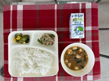 マーボーどうふは、中国の四川(しせん)料理の一つです。・給食では、みじん切りにしたしょうがやにんにく、トウバンジャンを綿実油で香りよくいため、さらに、牛ひき肉、豚ひき肉、とうふ、たまねぎ、にんじん、にらをいためて作ります。味つけは、料理酒、塩、こいくちしょうゆ、赤みそで、最後に水どきでん粉でとろみをつけます。