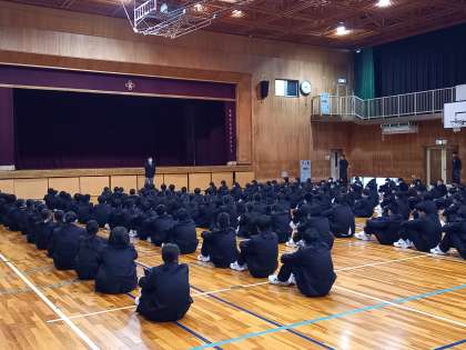 毎週水曜日は、1年生の学年集会が開かれます。学年集会では、学年の先生方が順番に話したり、学年全体に伝えたい連絡が行われます。
