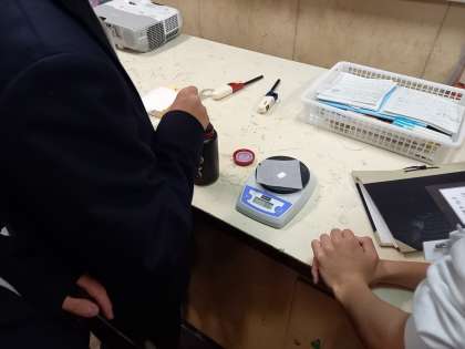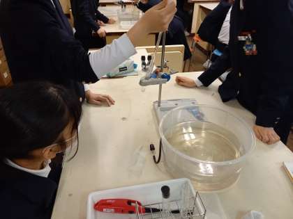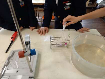 理科室では、2年生が炭酸水素ナトリウムの加熱実験を行っています。