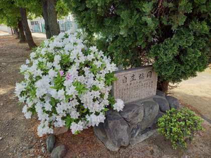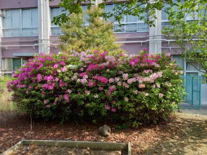 玄関横や中庭のツツジが見ごろを迎えています。美津島中学校は、敷地面積が広く中庭にはツツジや桜をはじめ薔薇(バラ)・梅・百日紅(さるすべり)・みかん・オリーブ・無花果(いちじく)・カリンなどなど様々な植物が植えられています。