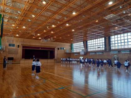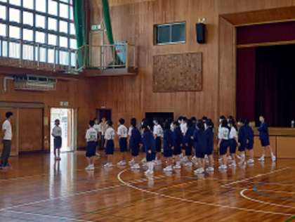 「1年〇組集合!」体育委員の掛け声で、クラスの生徒が一斉に走ってきて整列します。集合のあとは、体育委員から良かったところや改善点をみんなに説明していました。