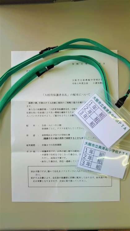 1年生対象に「入校用保護者名札」を2枚ずつ配布しています。