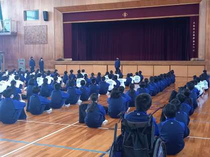 無事に美津島中学校に戻ってきました。帰校式を行っています。