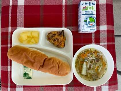 ドリアは、「ライスグラタン」の一種で、ピラフにホワイトソースをかけて、オーブンで焼いたものをいいます。今日の給食には、米、鶏肉、たまねぎ、グリンピースを使い、カレールウの素やクリームなどを加え、粉末チーズとパン粉をかけて焼いた「カレードリア」が登場します。