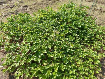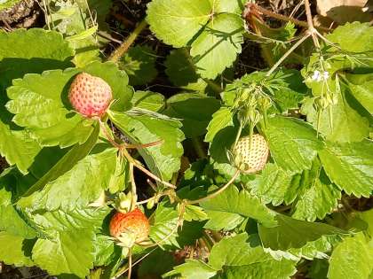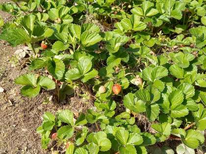 校内にある菜園では、春の日差しをいっぱい浴びてイチゴが実っています。