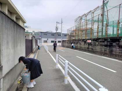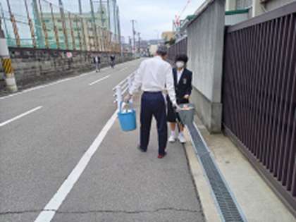 毎週火曜日、朝に行っている生徒会メンバーと生徒会担当の先生による清掃活動の様子です。昨日の夕方は風が強かったせいか、たくさんのゴミが溝に集まっていました。