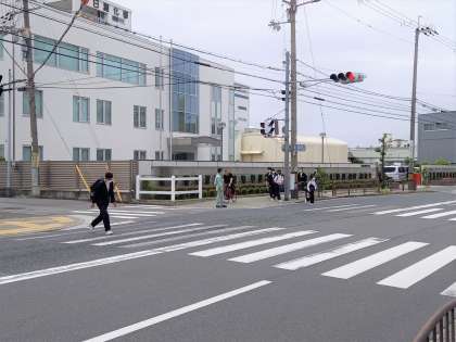 信号待ちをする生徒が自転車や歩行者とぶつからないように、管理作業員さんが登校を見守ってくれています。