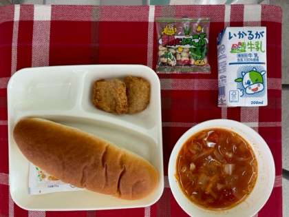 ミネストローネとは、イタリア語で「具だくさん」という意味で、たまねぎやにんじん、トマトなどの野菜がたくさん入ったスープのことをいいます。季節や好みにより、熱いままで食べたり、冷やして食べたりします。今日の給食では鶏肉(けいにく)とキャベツ、たまねぎ、トマトなどの野菜が使われています。