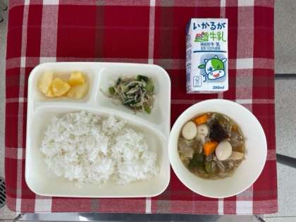 八宝菜は中国料理の一つです。「八宝」には、数が多いという意味があり、よい材料を多く使って作った料理のことを八宝菜といいます。今日の給食では、豚肉、うずら卵、たまねぎ、キャベツ、にんじん、たけのこ、ピーマン、しいたけの8種類の材料を使用しています。
