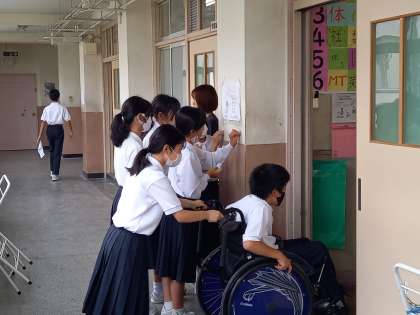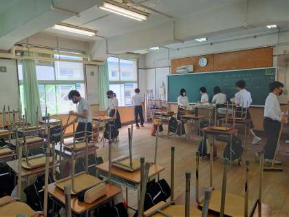 2時間目以降は、学年ごとに集会や大掃除を行いました。普段は、掃除しない特別教室や扇風機、エアコンのフィルターなどもきれいに掃除しました。1年生では壁の汚れをスポンジを使って落としています。