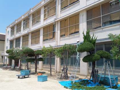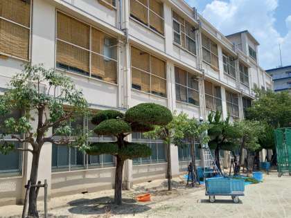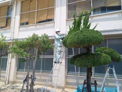 炎天下の中、頑張っているのは生徒だけではありません。管理作業員さんもグランドに面した木々の剪定作業を行っています。