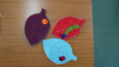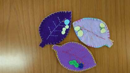 「フェルトを使った小物作り」講座で、葉っぱのコースターを作りました。アクセントには可愛いい青虫などが付いています!ブランケットステッチ、覚えたかな。