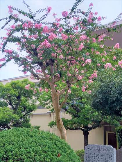 写真は、玄関にある「百日紅(さるすべり)」の木です。台風一過、とてもきれいに花を咲かせています。「木の幹がツルツルしていて、猿も登れない?」というところからこの名前がつきました。
