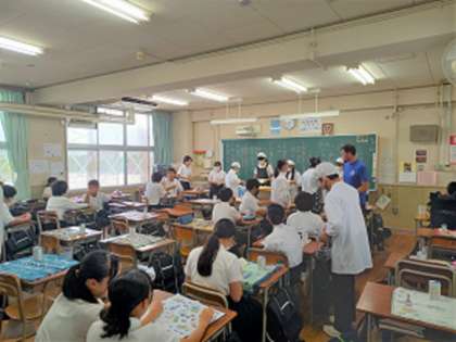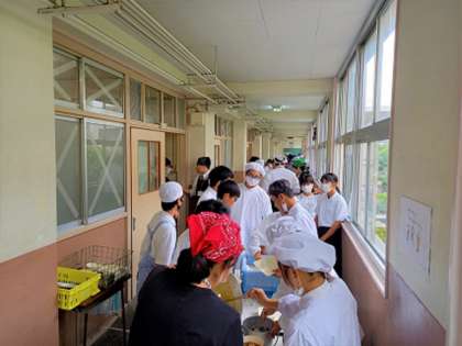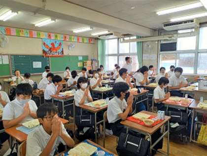 今日は、みんな大好きなビーフカレーです。みんなで協力して楽しく給食をいただいています。