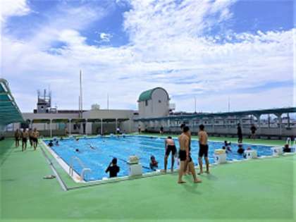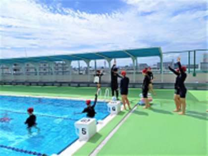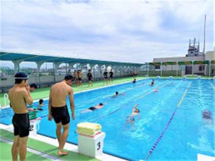 今日で8月が終わりですが、まだまだ日差しも強く暑い日が続いています。屋上のプールでは、クロールや平泳ぎ、背泳ぎなど種目に合わせてそれぞれが練習しています。女子の授業では実習生がプールに入り指導しています。写真は、2年生の水泳の授業です。