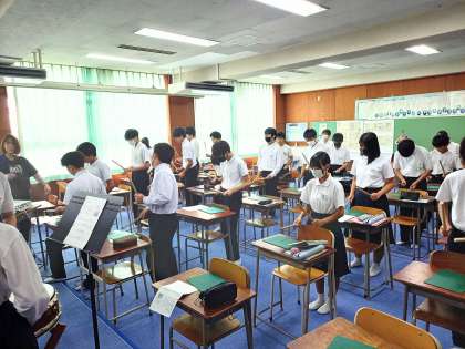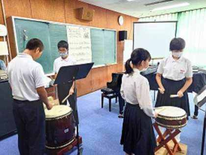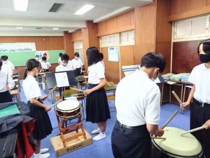 写真は、3年生音楽の様子です。バチをもって太鼓の練習をしています。