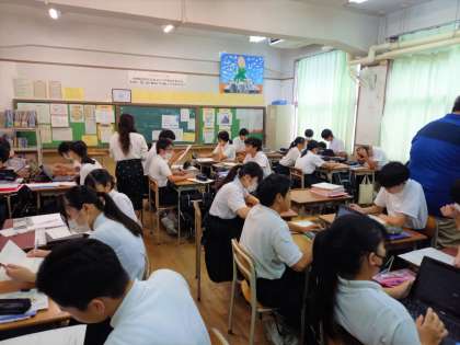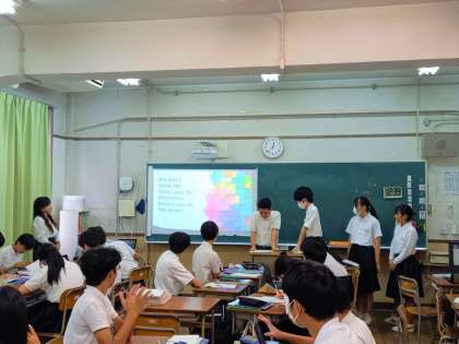 3年生英語では、「歩きスマホ」を取り締まる法律を制定することに対して、賛成or反対のどちらかをグループごとに選択し、その理由を英文で発表する取り組みを行っています。