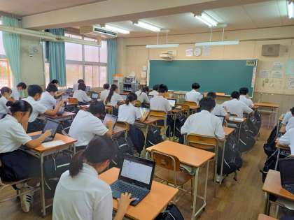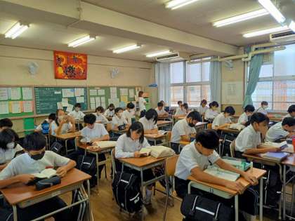 3年生は、グランドで学年集会を行っています。2年生は、教室でデジタルドリルの問題に取り組んでいます。1年生は、それぞれが選んだ本を読む朝読書に取り組んでいます。