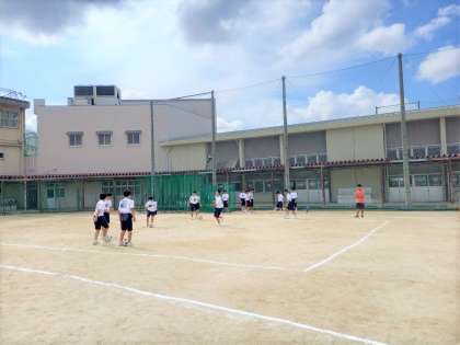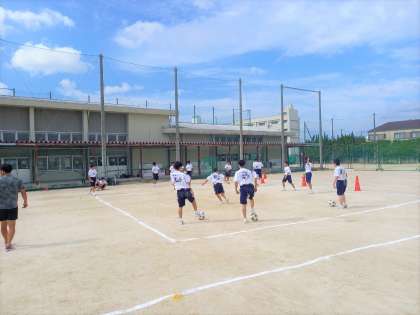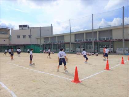 男子は水泳が終わり、サッカーに取り組んでいます。今日は、相手の名前を呼んでパスをもらう練習をしていました。