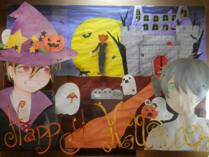 このディスプレイは、細かいところまで凝ってみました。ハロウィンの不気味さを出すために、背景を暗めにしたり、西洋の妖怪を出すなど工夫しました。よ〜く見ると、だれか部員が隠れています。3年生、最後の大作をぜひ見に来てください。今までありがとうございました。(上のディスプレイ↑)