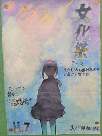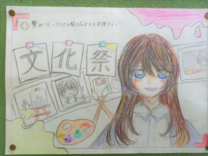 今年の文化祭のスローガンは「繋がり〜クラスの輪を広げ、力を発揮する〜」です。ポスターは各学年の廊下に張り出されています。