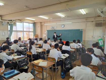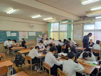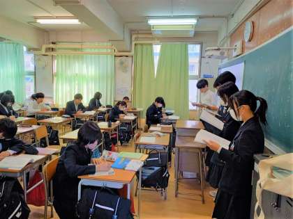 (下)3年生 国語で班ごとに「奥の細道」の群読をしています。