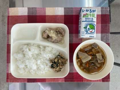 沖縄の伝統的な料理は、「琉球(りゅうきゅう)料理」と呼ばれています。昔から交流のあった中国など諸外国の影響を受け、発展していきました。豚(ぶた)肉(にく)、海藻、豆腐(とうふ)、野菜など沖縄の土地に根ざした食材を多く使っており、栄養バランスに優れています。ソーキ汁とは、豚の骨付きあばら肉をだいこんなどと一緒にやわらかく煮こんだ汁のことです。給食では豚ばら肉を使用しています。