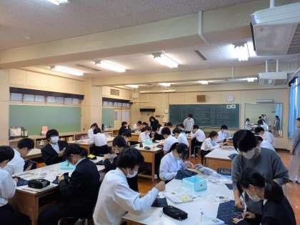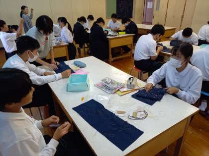 1年生は、刺し子の実習を行っています。元気アップボランティアの方々も多数来ていただき、実習の補助をしていただいています。