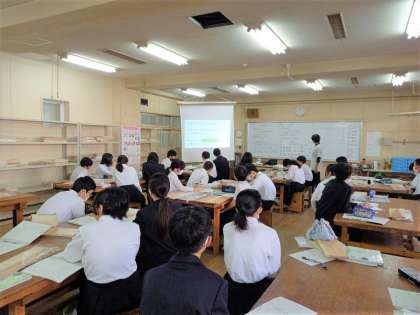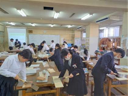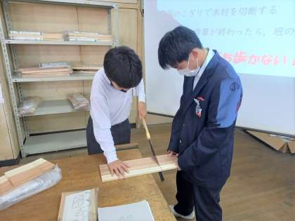 1年生では、木材加工の授業を行っています。のこぎりの切り方などについての映像を見て、班で確認してから実習に入りました。本立てなど個人で設計した寸法通りにのこぎりを使って切っていきます。。