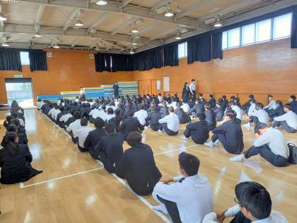 3年生は、新しく床を張り替えた格技室で集会をしています。