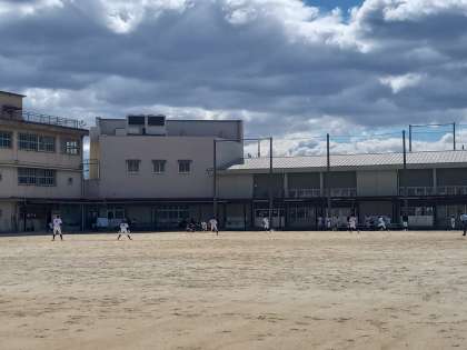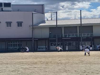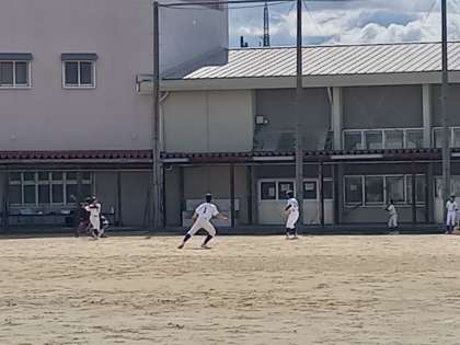 グランドでは、野球部が練習試合を行っています。