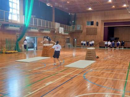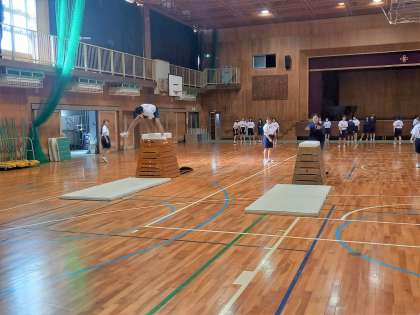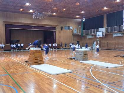 3年生女子は、体育館で跳び箱の授業をしています。次々と高い段の跳び箱を跳んでいきます。