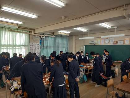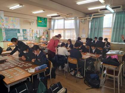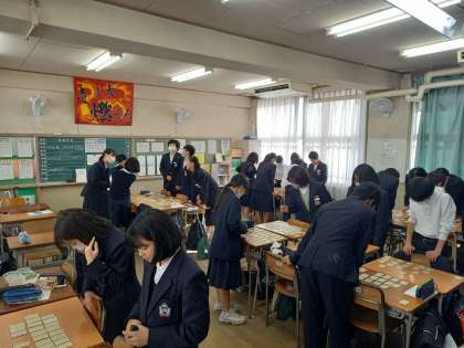 1年生では、1月に行われる百人一首大会に向けて、クラスごとに百人一首を行いました。