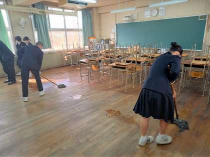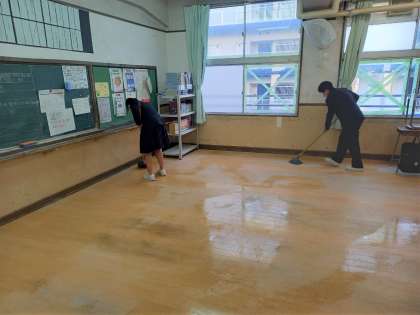 終学活ののち、美化委員が教室の油引きをしてくれています。
