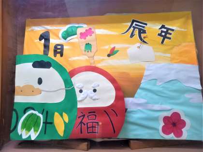 新年を迎える準備が整っています。美術部製作の1月のディスプレイが飾られました。来年の干支(辰)に扮したかわいいだるまさんが描かれています。