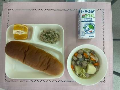 フランスの家庭料理の一つで、肉や野菜などを煮込(にこ)んだスープのことを「ポトフ」と呼びます。スープと一緒に煮込んだ肉や野菜も食べます。給食では、牛肉やウインナー、じゃがいも、キャベツ、にんじん、パセリを使って作っています。