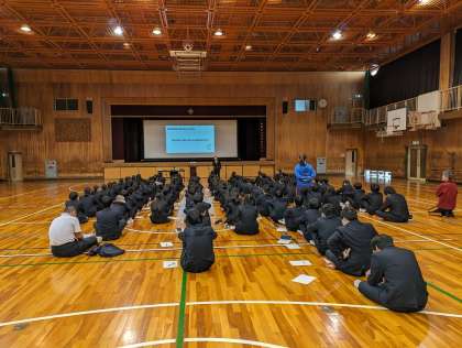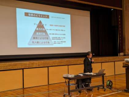 2年生は、国際クラブのソンセンニムに来ていただき、体育館で人権学習を行いました。