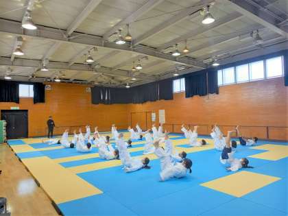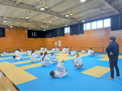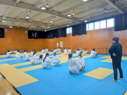 2年生女子体育では、柔道の授業を行っています。今日は、後ろ受け身の練習をしています。みんな、きれいにきまっています。
