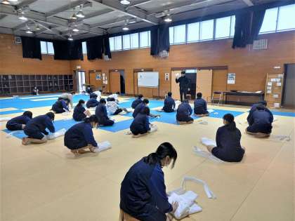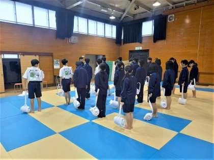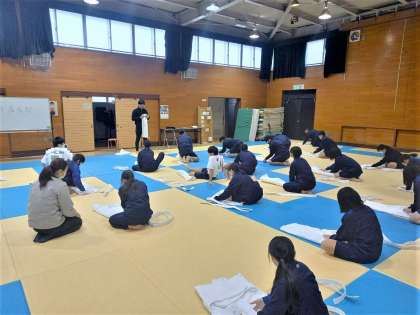 柔道の授業後、柔道着をきれいにたたんでいます。