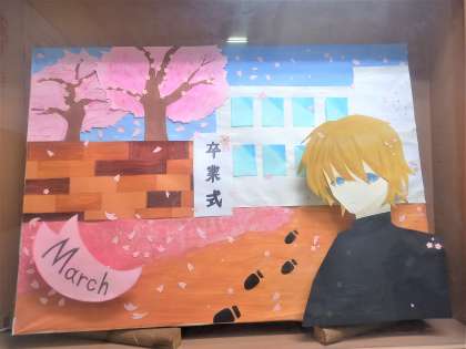 卒業式を来週に控え、3月の美術部ディスプレイが飾られました。